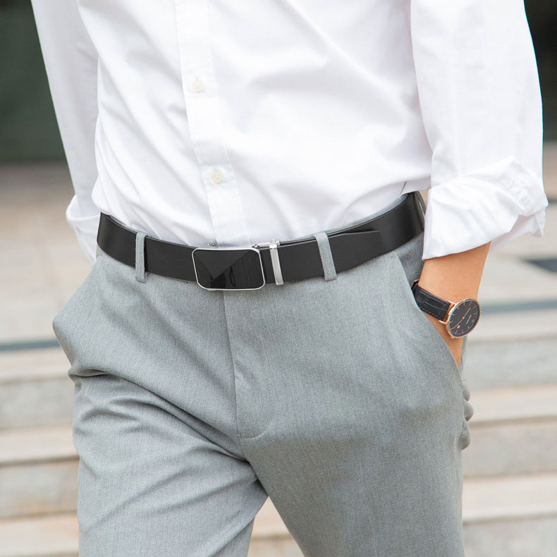 Buckle Color: The belt sports a sleek silver buckle.Belt Color: It comes in versatile black and brown colors.Upper Material: Crafted from genuine cowhide leather, the belt exudes quality.Fastening Method: The belt features an automatic buckle for effortless fastening.Lining: A polyester lining enhances the belt’s durability and comfort.Pattern: The belt has a refined solid color design.Length: Measuring 120 ”, the belt offers a flexible fit.Width: At 3.8 ” wide, the belt presents a sturdy and stylish profile.Weight: The belt weighs 300 grams, providing a solid and comfortable feel.