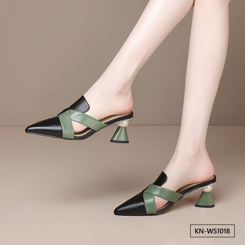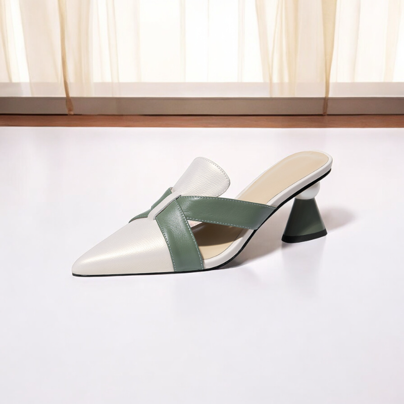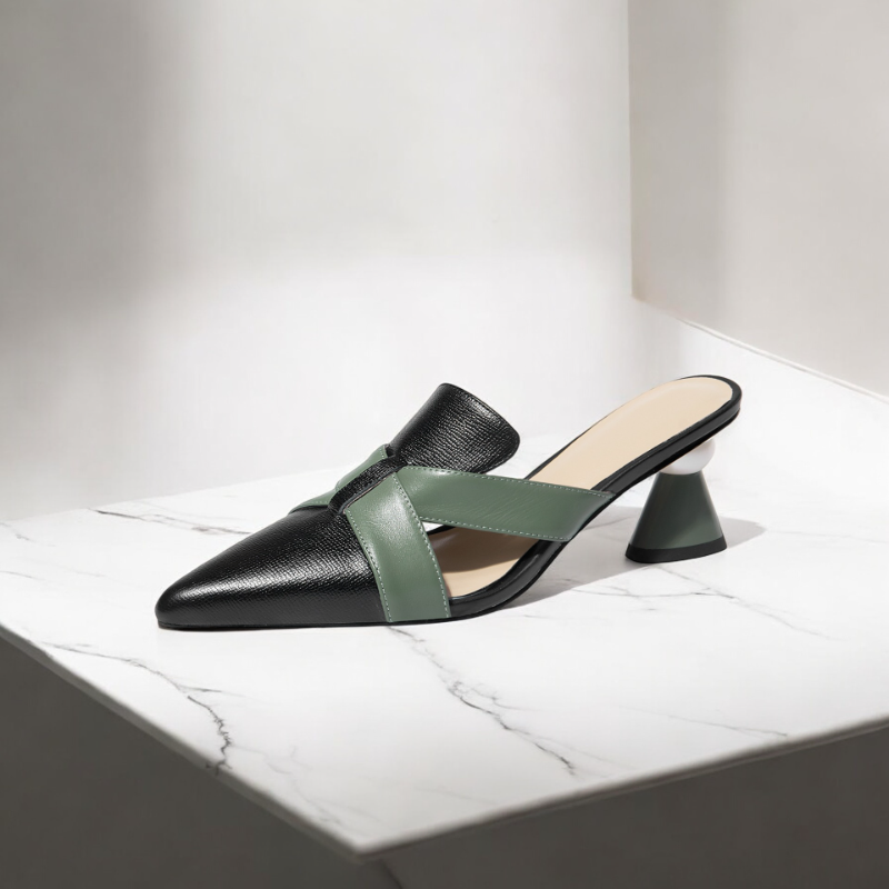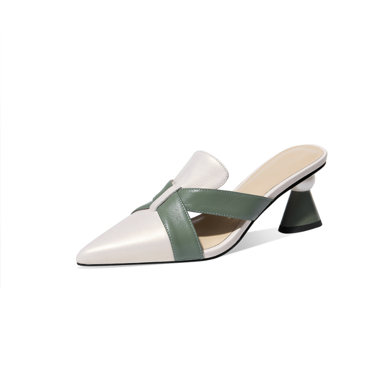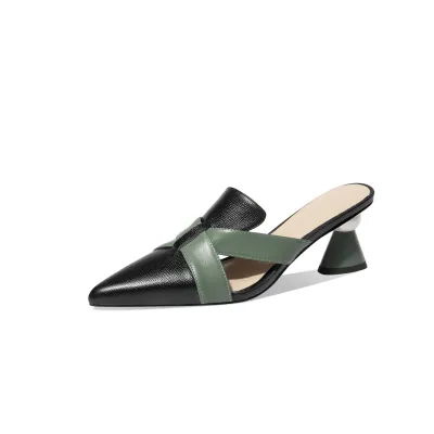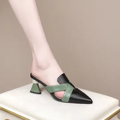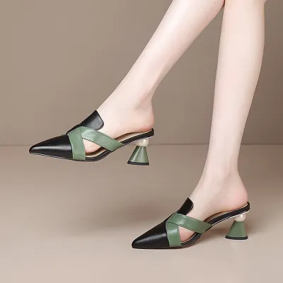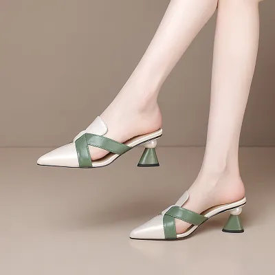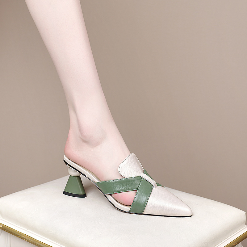 Upper Material: Genuine C-o-w-h-i-d-e leather ensures a luxurious and durable finish.Outsole Material: The rubber sole offers excellent traction and longevity.Insole Material: PU leather provides plush cushioning and comfort.Toe Shape: The pointed toe design adds a sleek and refined touch.Closure Type: The slip-on style makes the sandal easy to put on and take off.Heel Height: The 6 cm heel height provides a stylish lift while maintaining comfort.Pattern Type: The solid color pattern offers a timeless and versatile look.Features: The sandal features breathability, wear-resistance, a lightweight build, and anti-slip properties for both functionality and style.