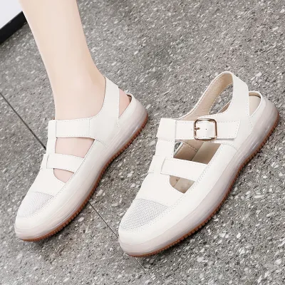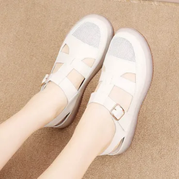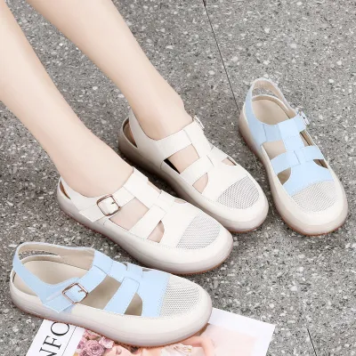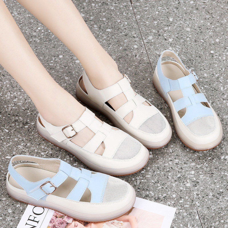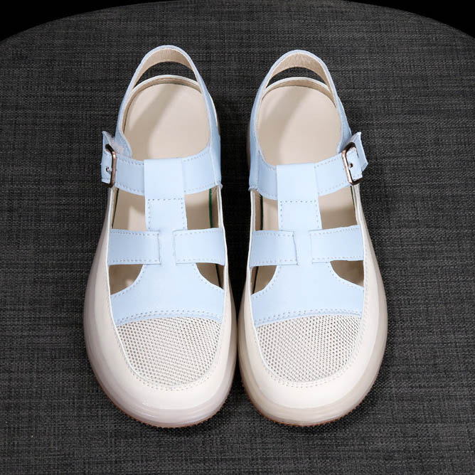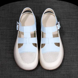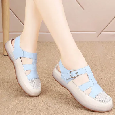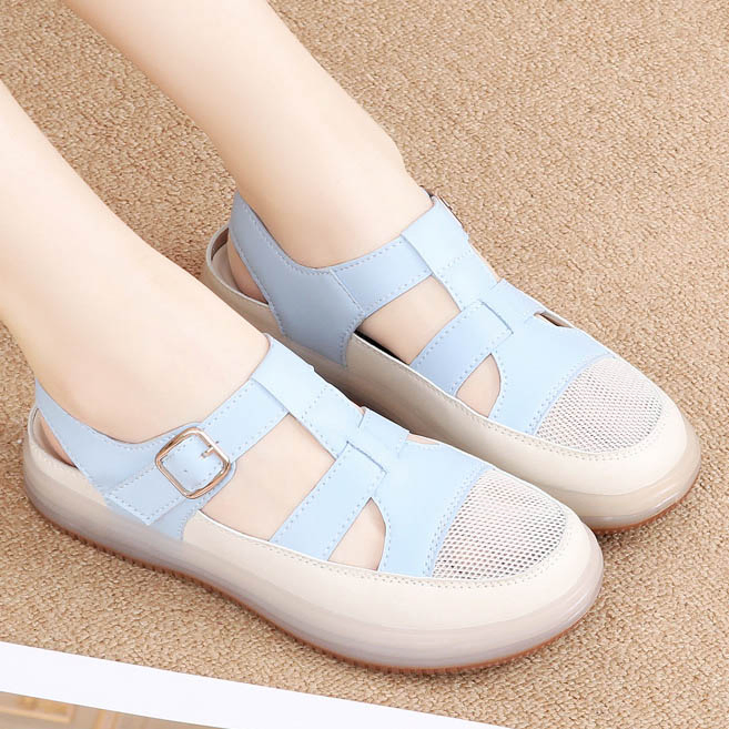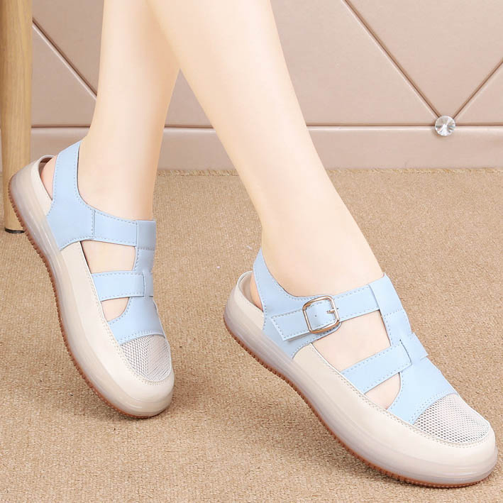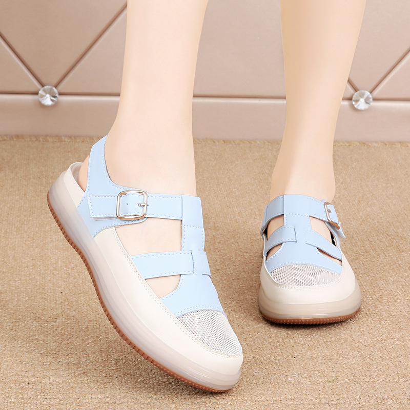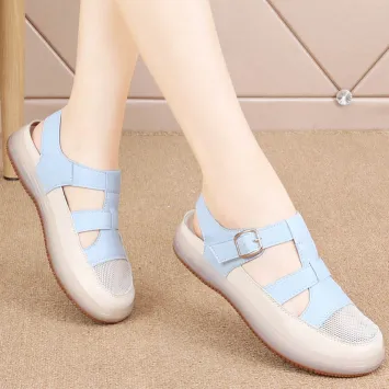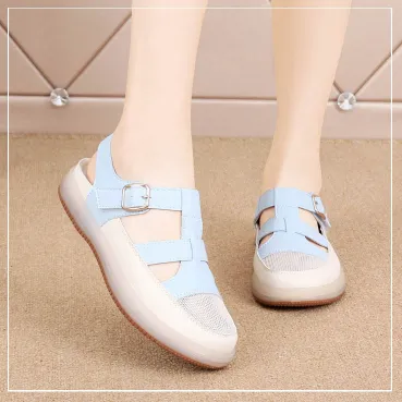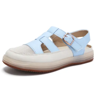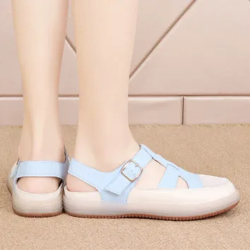 Color: The sandal comes in vibrant blue and classic beige.Upper Material: PU leather provides a sleek and durable finish.Outsole Material: The PVC sole offers flexible support and reliable traction.Insole Material: PU leather ensures soft cushioning for all-day comfort.Toe Shape: The round head toe shape delivers a comfortable and spacious fit.Closure Type: The Velcro closure allows for easy adjustability and a secure fit.Heel Height: The 2.5 cm heel height offers a modest lift with enduring comfort.Pattern Type: The solid color pattern maintains a clean and versatile appearance.Features: The sandal combines breathability, wear-resistance, a lightweight structure, and anti-slip properties for practical and stylish wear.