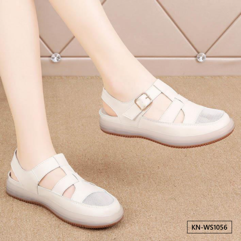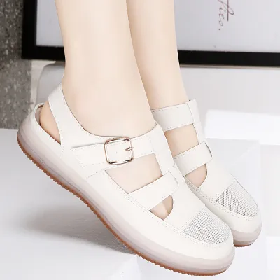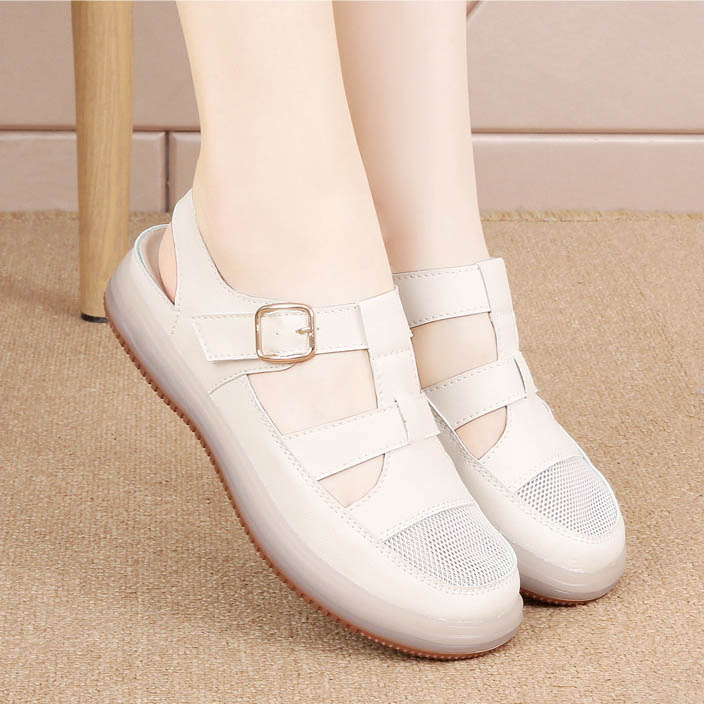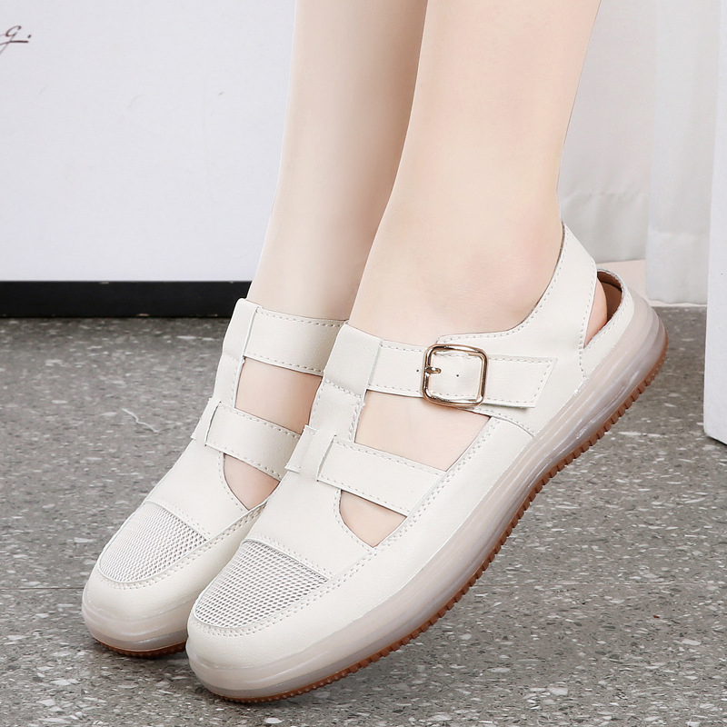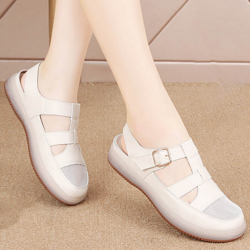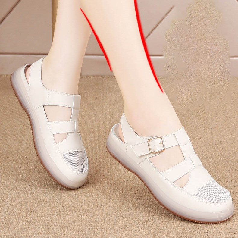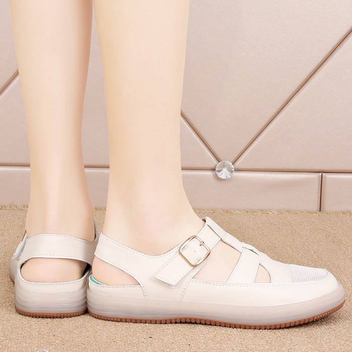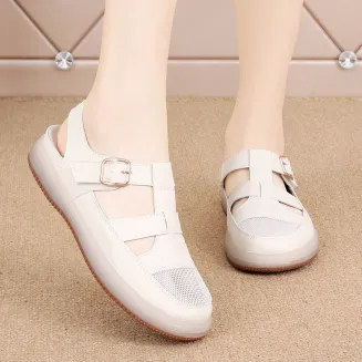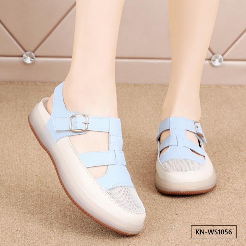 Color: The sandal comes in vibrant blue and classic beige.Upper Material: PU leather provides a sleek and durable finish.Outsole Material: The PVC sole offers flexible support and reliable traction.Insole Material: PU leather ensures soft cushioning for all-day comfort.Toe Shape: The round head toe shape delivers a comfortable and spacious fit.Closure Type: The Velcro closure allows for easy adjustability and a secure fit.Heel Height: The 2.5 cm heel height offers a modest lift with enduring comfort.Pattern Type: The solid color pattern maintains a clean and versatile appearance.Features: The sandal combines breathability, wear-resistance, a lightweight structure, and anti-slip properties for practical and stylish wear.