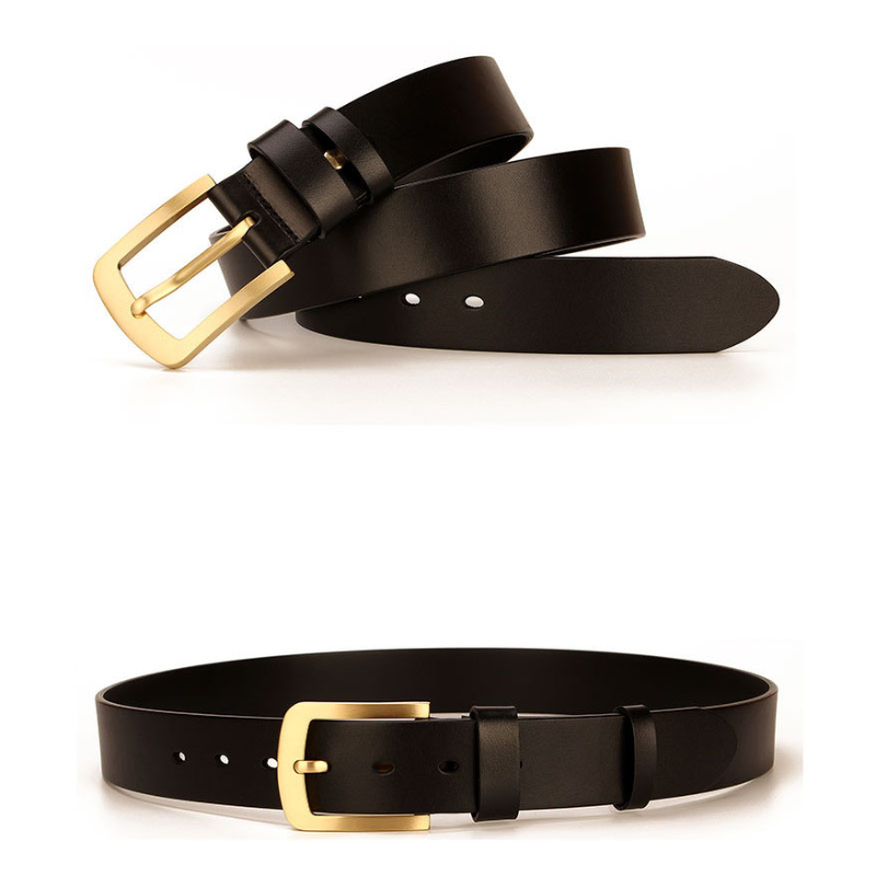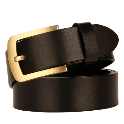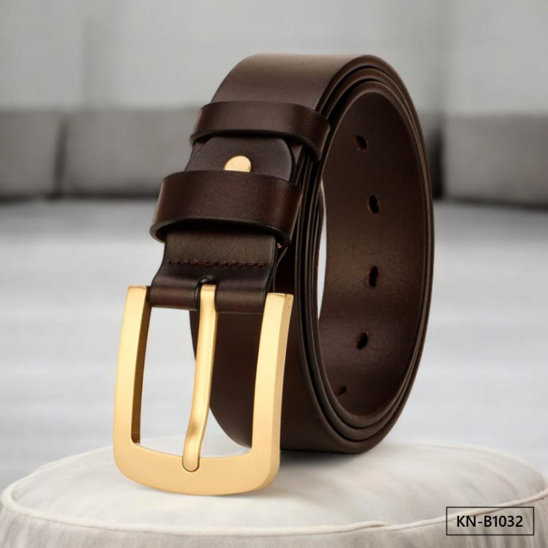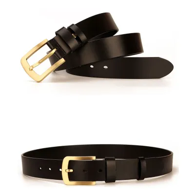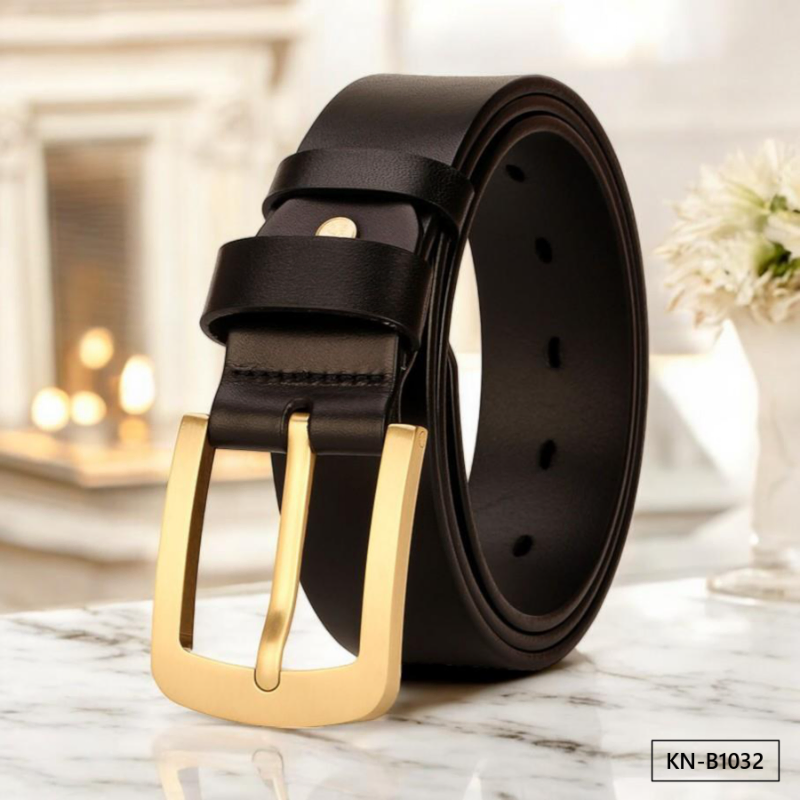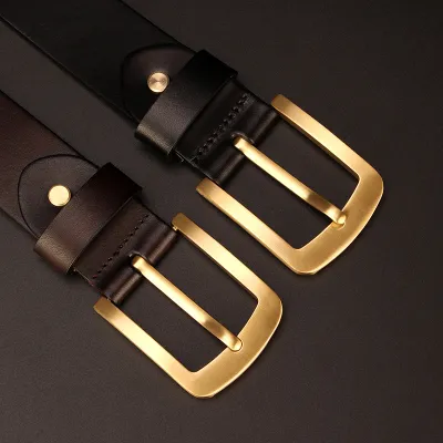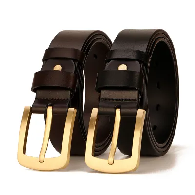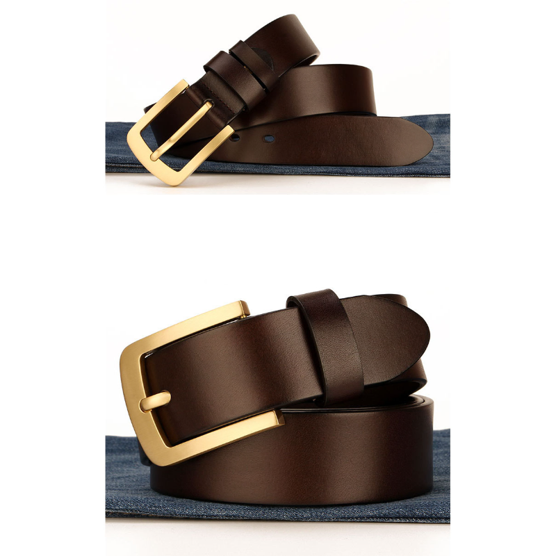 Buckle Color: The belt features an elegant gold buckle.Belt Color: It comes in two classic colors: brown and black.Upper Material: The belt is crafted from genuine cowhide leather for a luxurious finish.Fastening Method: It uses a traditional buckle for secure fastening.Lining: The polyester lining adds comfort and durability to the belt.Pattern: The belt exhibits a timeless solid color pattern.Length: With a length of 120 ”, the belt provides ample adjustability.Width: The belt's width of 3.8 ” offers a balanced and sturdy appearance.Weight: Weighing 300 grams, the belt combines durability with a comfortable fit.