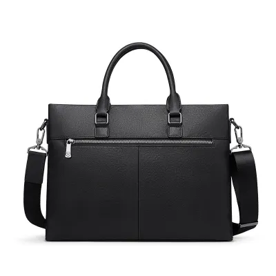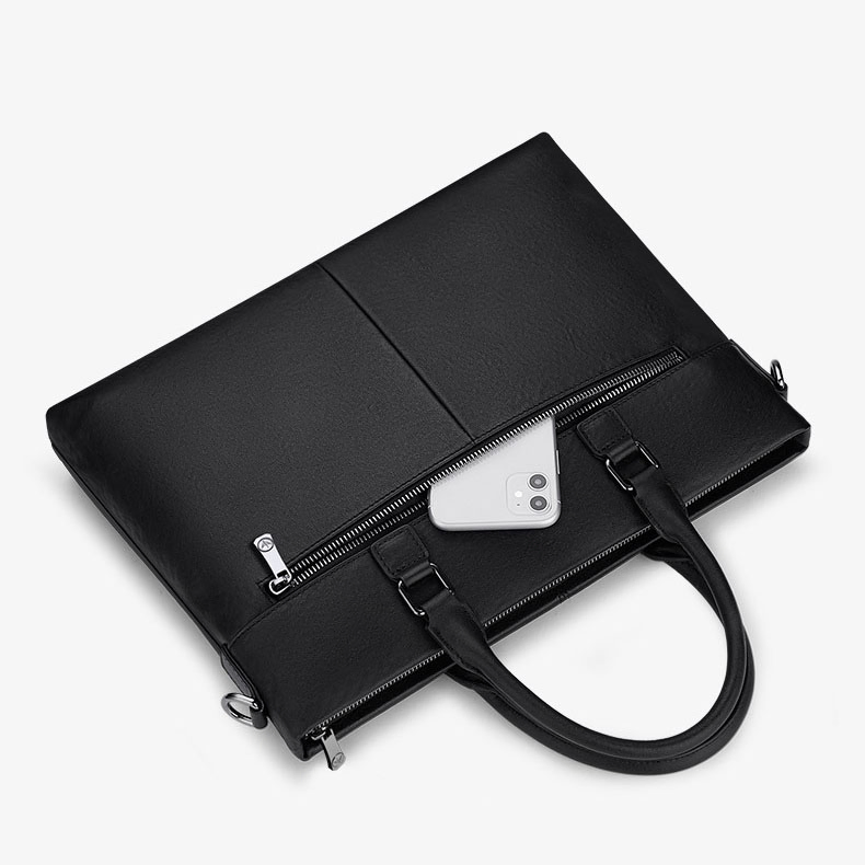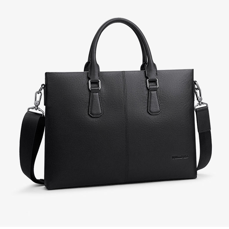 Color: The bag features a striking black color, which provides a sophisticated and versatile look.Brand: William POLO crafts this bag with a focus on quality and refined style.Upper Material: It uses genuine leather for the upper material, ensuring a premium and durable finish.Number of Shoulder Straps: The bag includes a single shoulder strap for ease of carrying.Opening Method: A zipper closure offers secure storage and quick access to your belongings.Hardness: The bag’s soft texture provides comfort and flexibility for everyday use.Shape: The handbag shape balances practical functionality with an elegant design.Pattern: The solid color pattern enhances the bag's classic and timeless appeal.Lining Material: Inside, the polyester lining adds durability and makes maintenance simple.Size: With dimensions of 14.96" (L) x 10.82" (H) x 2.67" (W), the bag is compact yet provides ample space.Features: It includes multi-functionality, a 13" computer compartment, and waterproof capabilities for versatile use.Weight: Weighing just 1 kg, the bag remains lightweight and easy to handle.