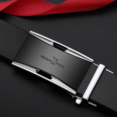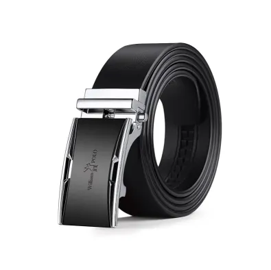 Buckle Color: The buckle displays a sleek silver finish.Belt Color: The belt comes in an elegant black hue.Brand: William Polo produces this high-quality belt.Upper Material: Genuine leather forms the belt’s durable and refined surface.Fastening Method: The smooth buckle allows for easy and secure adjustments.Lining: The belt features a soft polyester lining for comfort.Pattern: The belt has a clean and classic solid color pattern.Length: The belt measures 120 ”, accommodating various sizes.Width: The belt provides a width of 3.8 ” for a balanced look.Weight: The belt weighs 350 grams, combining durability with a manageable weight.