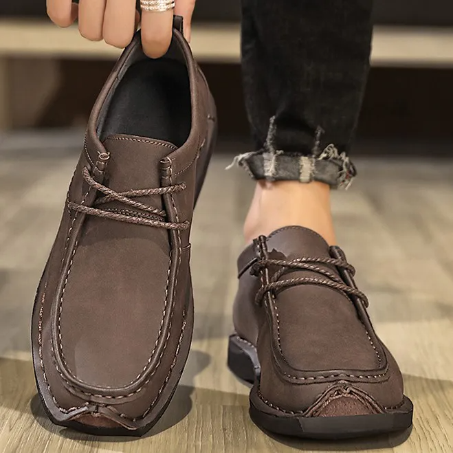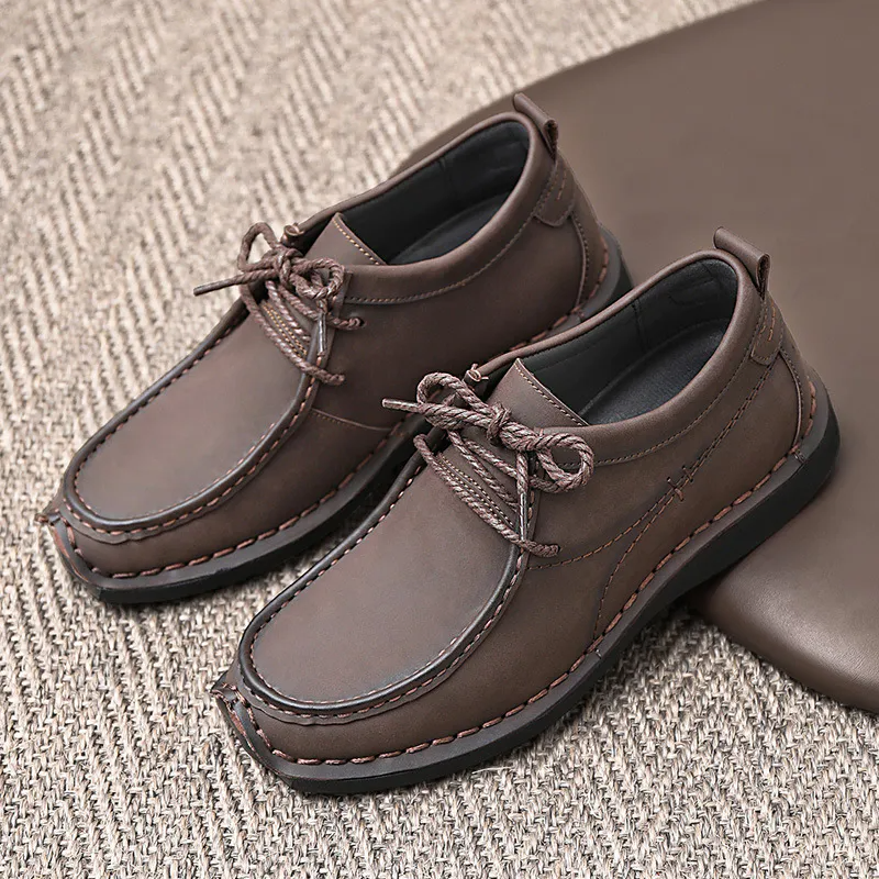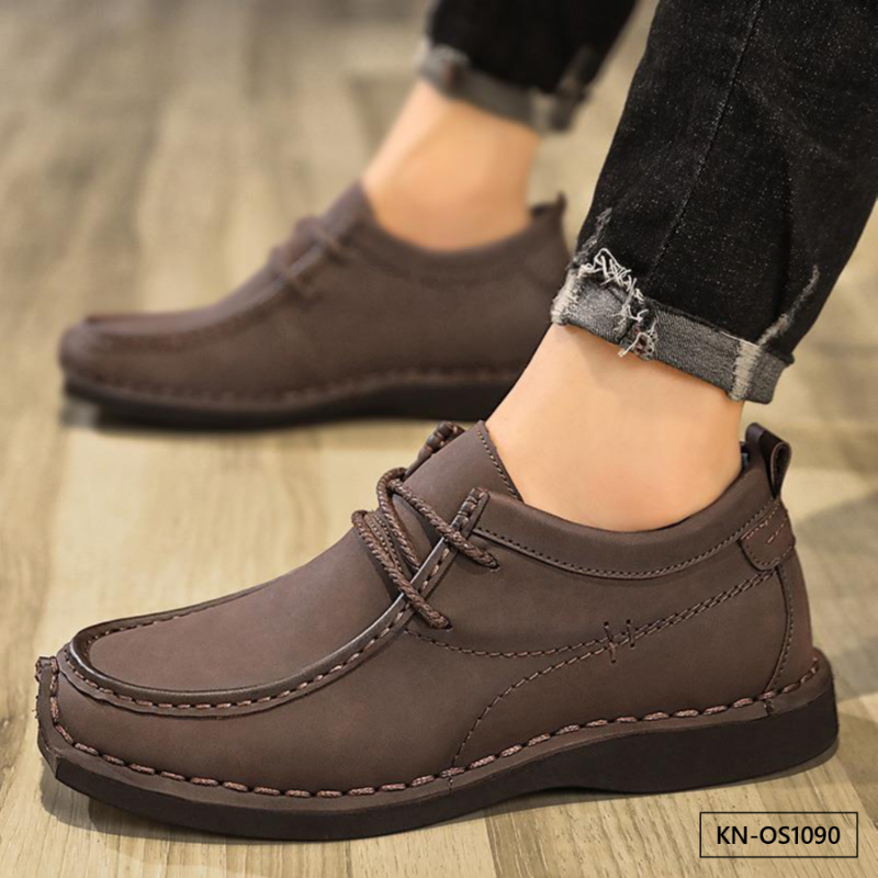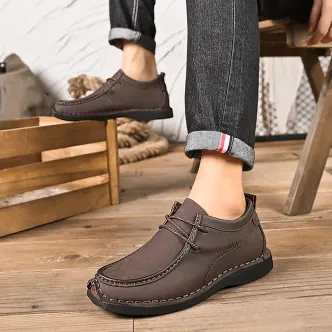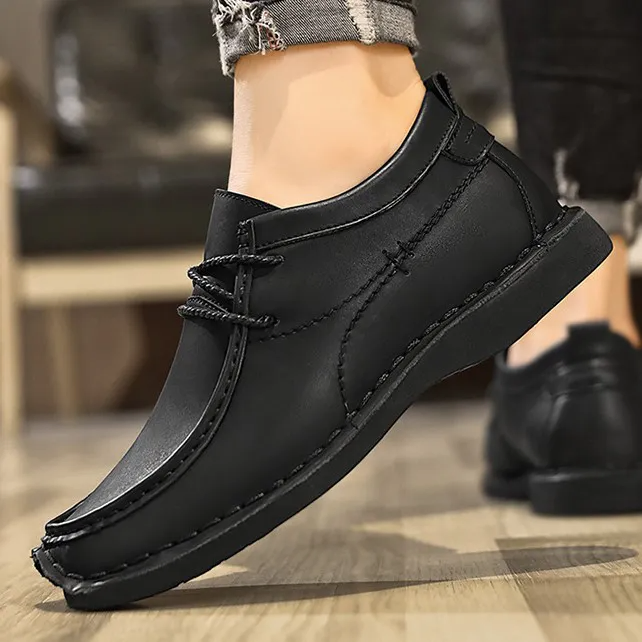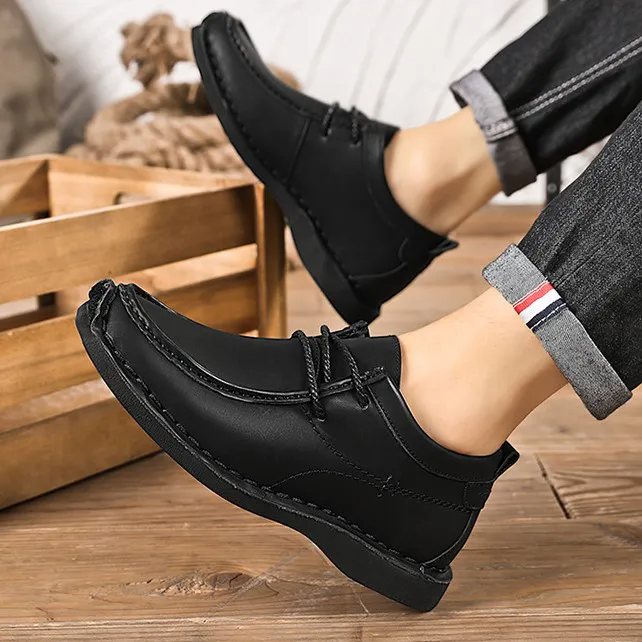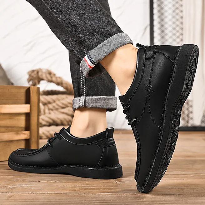 Color: The shoe features a sophisticated blend of black and dark brown hues.Upper Material: Crafted from genuine C-o-w-h-i-d-e leather, the shoe's upper ensures durability and a premium appearance.Outsole Material: A rubber sole provides the shoe with excellent grip and resilience against wear and tear.Insole Material: The shoe's insole is made from EVA, offering lightweight cushioning and comfort.Toe Shape: Designed with a round toe shape, the shoe prioritizes comfort and natural foot movement.Closure Type: It secures with a lace-up closure, allowing for a snug and adjustable fit.Pattern Type: Displaying a solid pattern, the shoe maintains a classic and versatile aesthetic.Features: Engineered for breathability, wear-resistance, lightweight feel, and anti-slip properties, making it suitable for active lifestyles.
