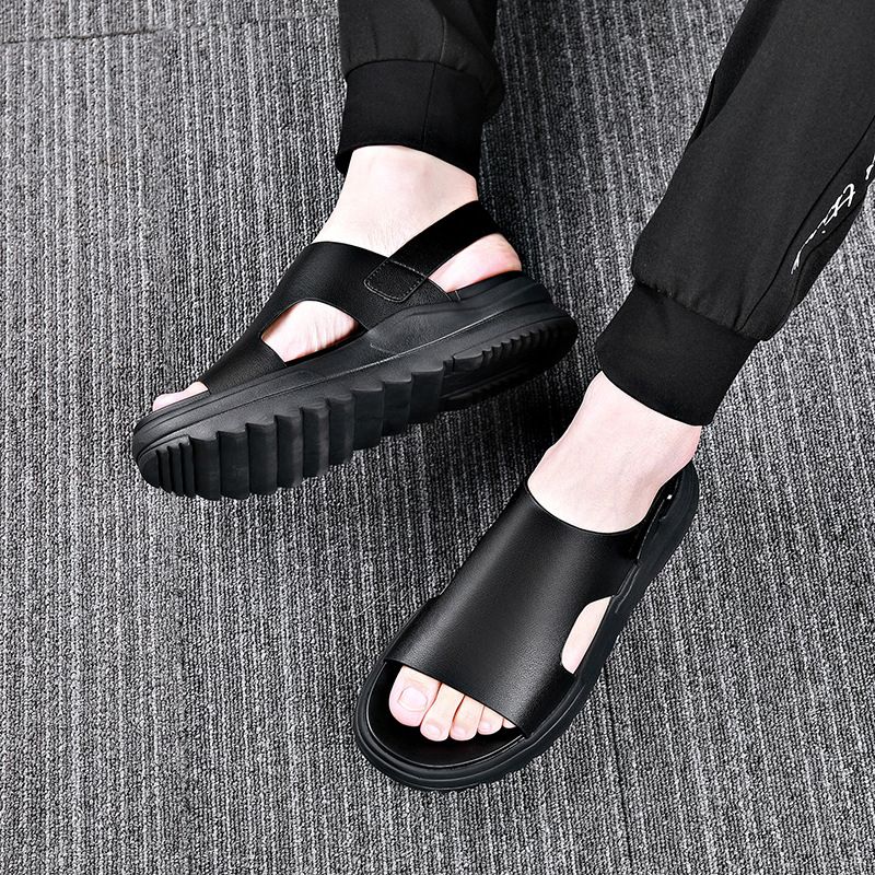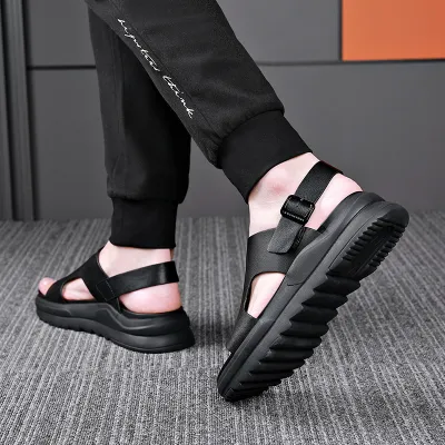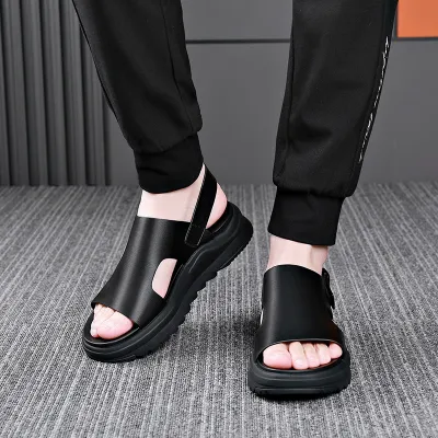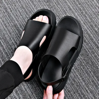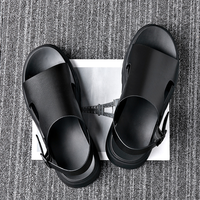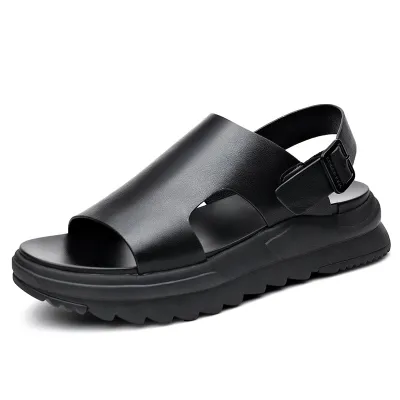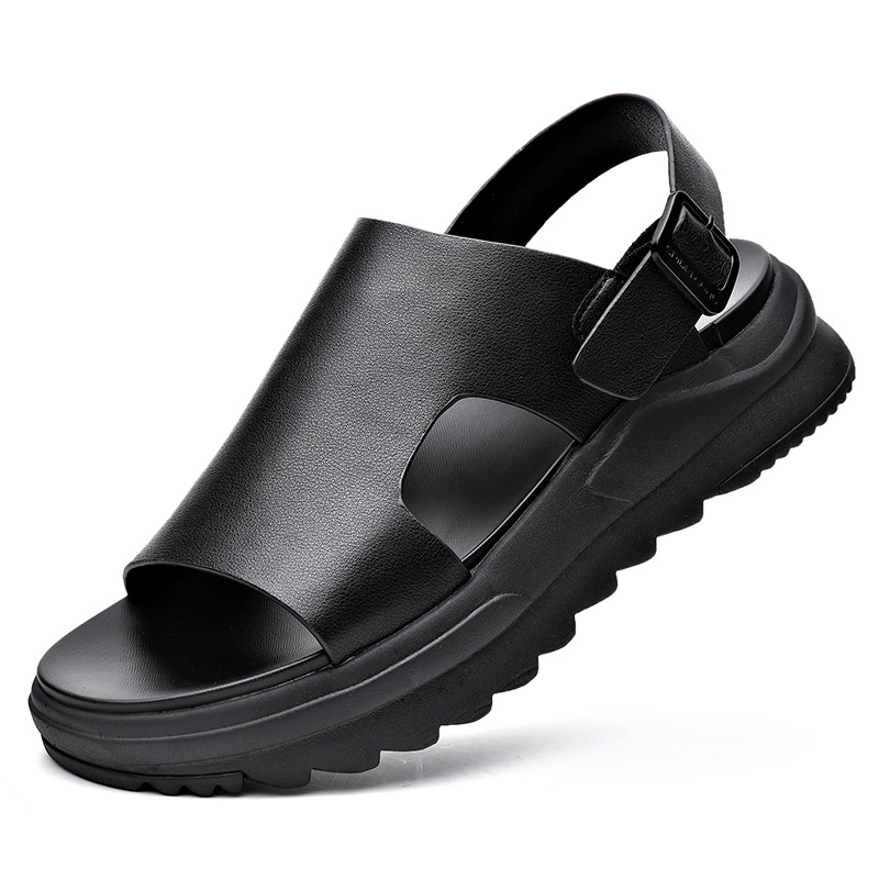 Color: The shoe is styled in classic black, ensuring a versatile and timeless appearance.Upper Material: Crafted from genuine C-o-w-h-i-d-e leather, the shoe's upper guarantees durability and a luxurious texture.Outsole Material: A rubber sole provides the shoe with excellent grip and flexibility.Toe Shape: Featuring an open toe design, the shoe maximizes comfort and ventilation.Closure Type: It slips on effortlessly with the additional benefit of a back belt for secure fastening.Pattern Type: The shoe exhibits a solid pattern, accentuating its understated yet sophisticated look.Features: Engineered for breathability, wear-resistance, lightweight comfort, and anti-slip properties, making it ideal for various activities.