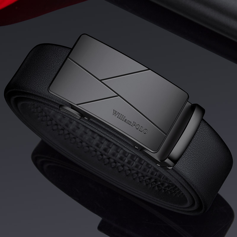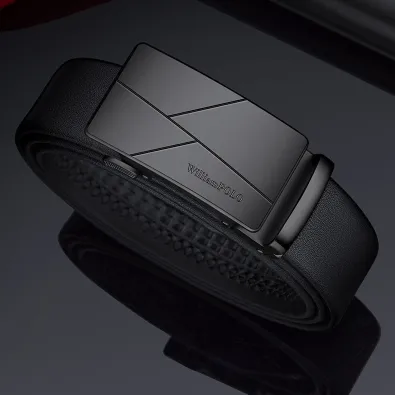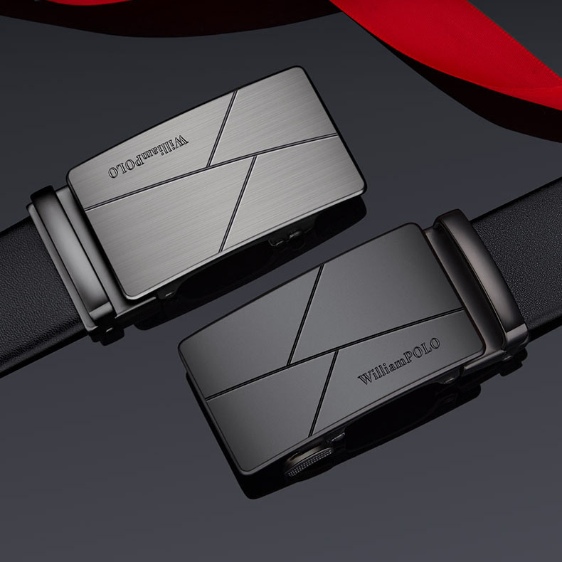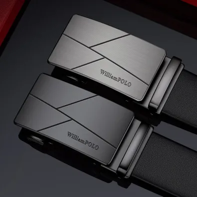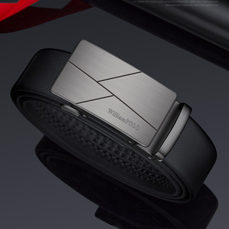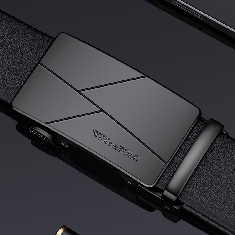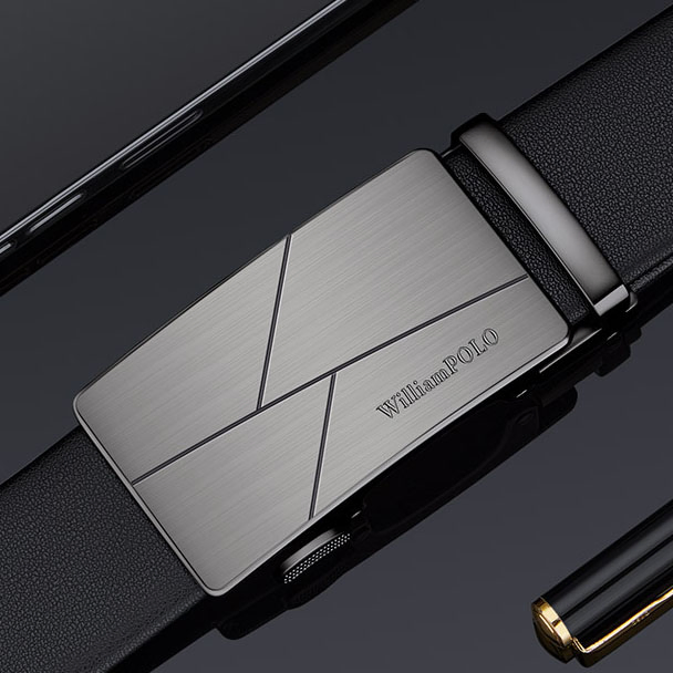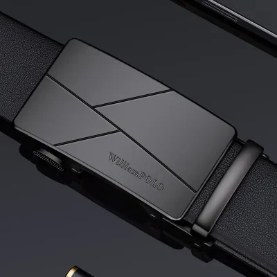 Buckle Color: The buckle features a sleek combination of gunmetal and silver.Belt Color: The belt is crafted in a classic black color.Brand: William POLO offers this belt with a focus on quality and elegance.Upper Material: Genuine leather provides both durability and a premium feel.Fastening Method: The automatic buckle allows for effortless and secure fastening.Lining: Polyester lining contributes to the belt’s comfort and longevity.Pattern: The belt presents a solid color for a refined and straightforward look.Length: With a length of 120 ”, the belt fits a variety of waist sizes.Width: The 3.8 ” width of the belt ensures a stylish yet practical design.Weight: The belt’s weight of 350 grams delivers a robust and substantial feel.