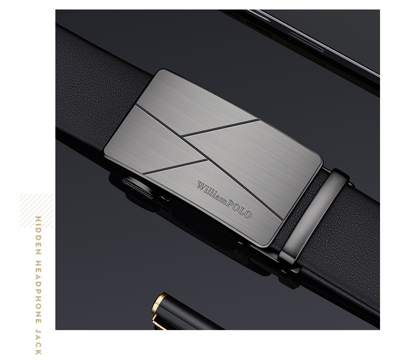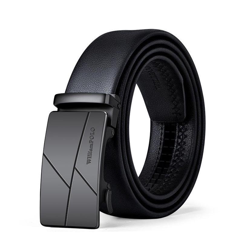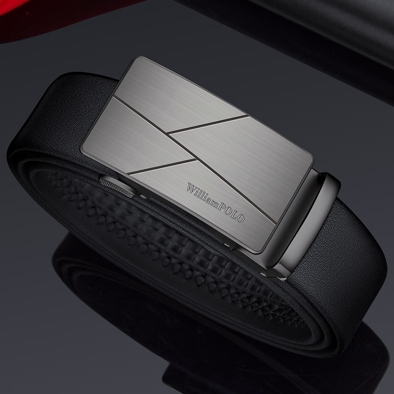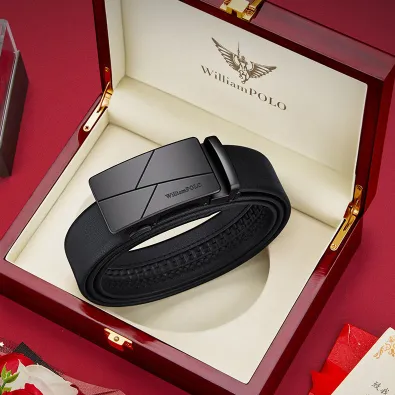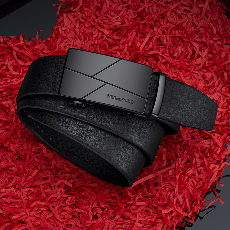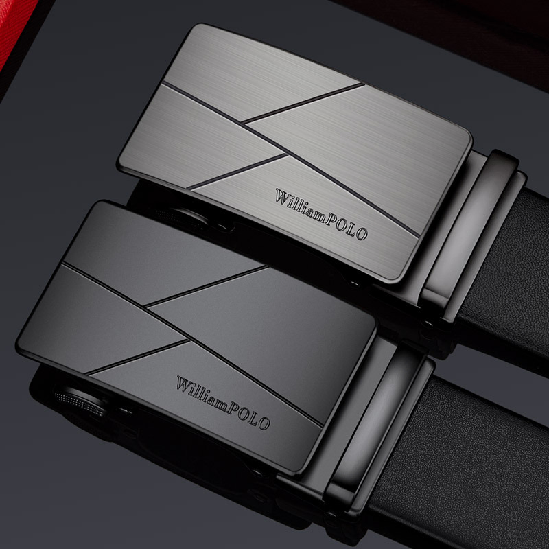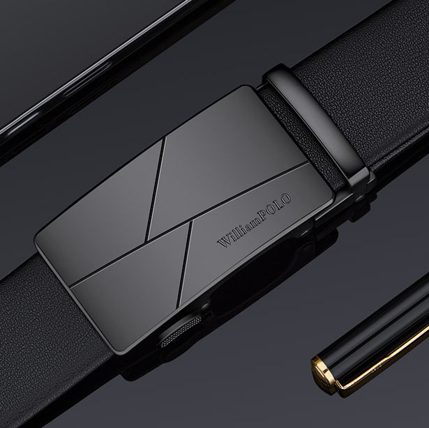 Buckle Color: The buckle features a sleek combination of gunmetal and silver.Belt Color: The belt is crafted in a classic black color.Brand: William POLO offers this belt with a focus on quality and elegance.Upper Material: Genuine leather provides both durability and a premium feel.Fastening Method: The automatic buckle allows for effortless and secure fastening.Lining: Polyester lining contributes to the belt’s comfort and longevity.Pattern: The belt presents a solid color for a refined and straightforward look.Length: With a length of 120 ”, the belt fits a variety of waist sizes.Width: The 3.8 ” width of the belt ensures a stylish yet practical design.Weight: The belt’s weight of 350 grams delivers a robust and substantial feel.